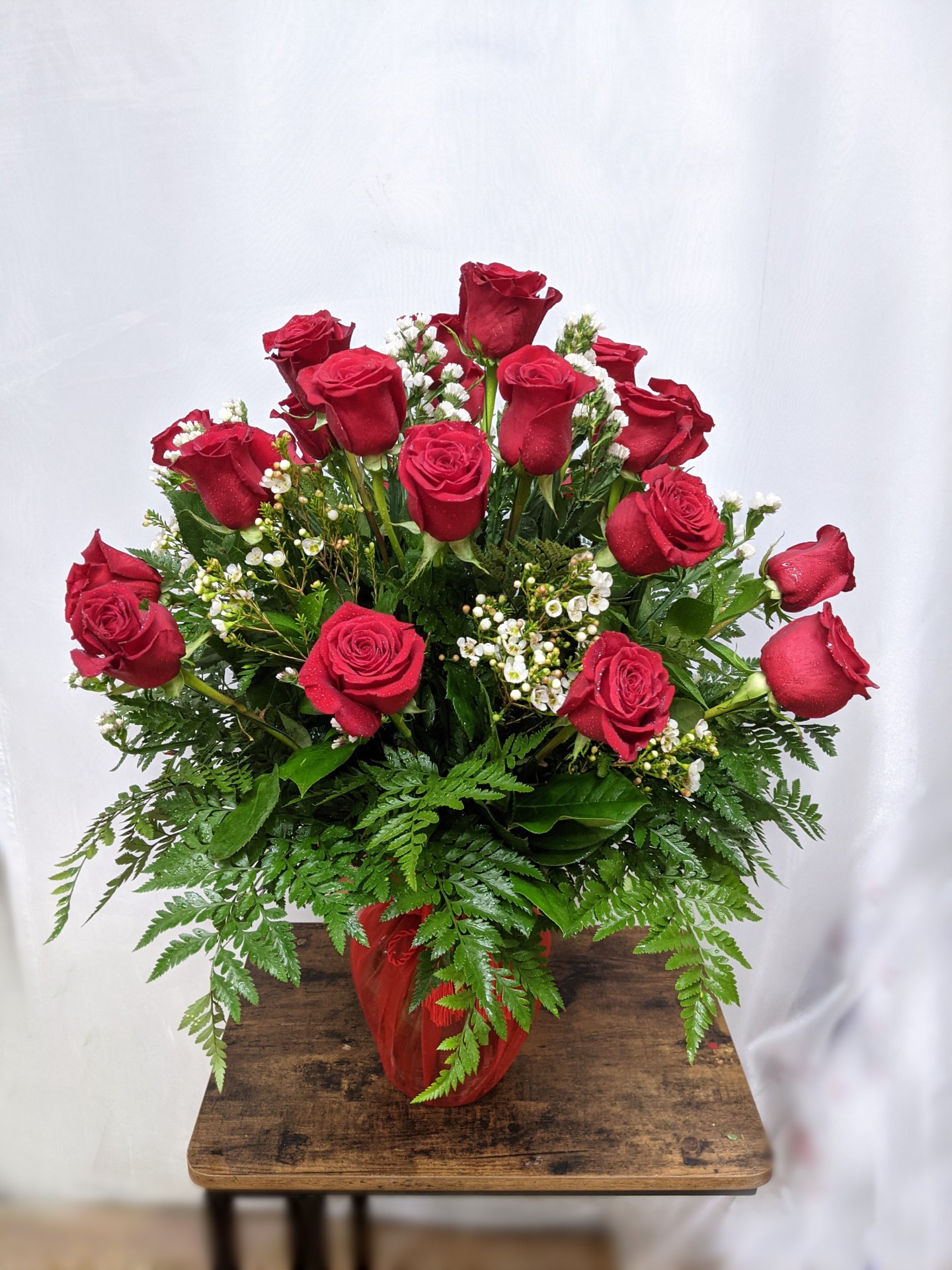 18 roses in a vase.