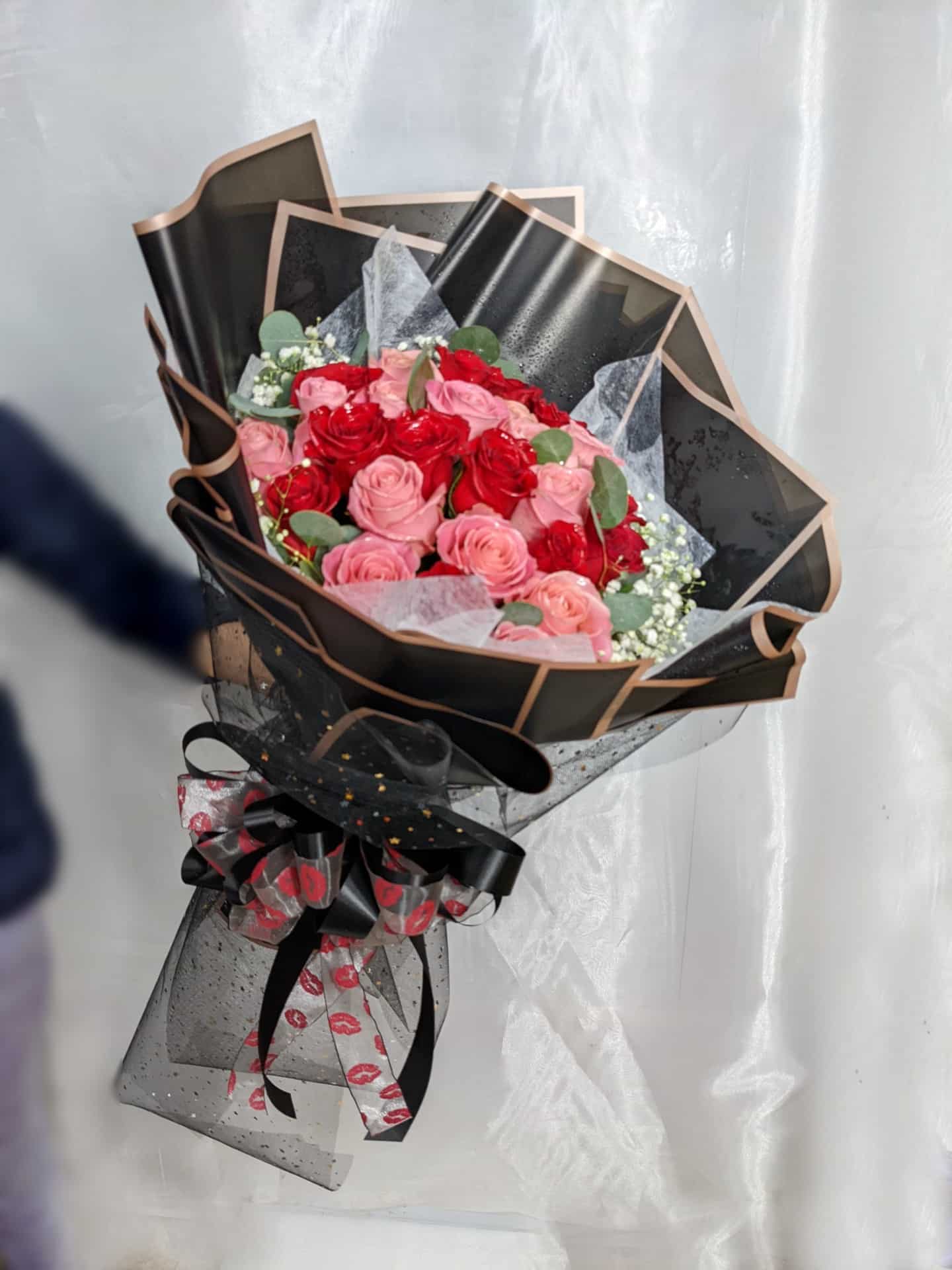 A dozen roses, and mixed flowers are in a container and bouquet wrapping.