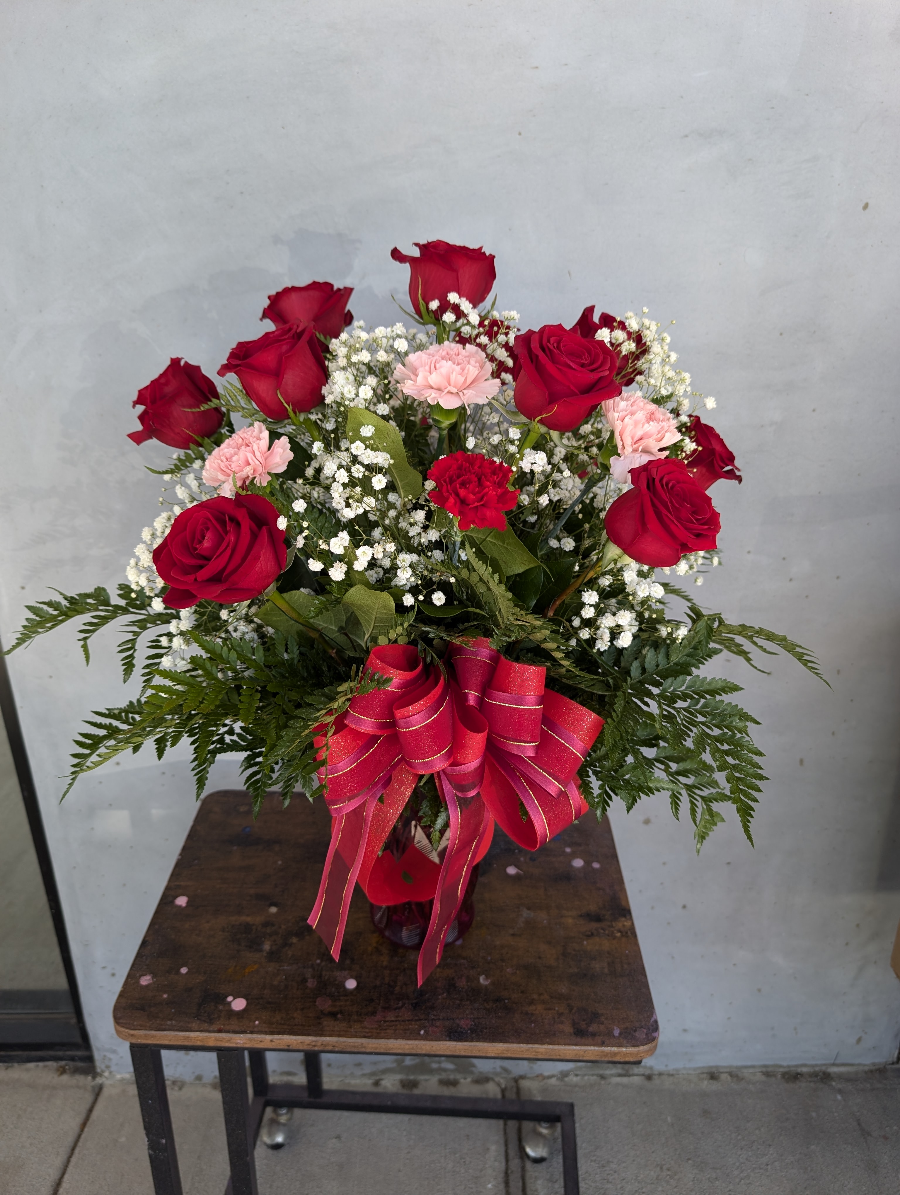 Red roses, and carnations with baby’s breath and greenery — perfect for birthdays, congratulations, or to bring vibrant cheer to any space in Rowland Heights or Hacienda Heights.