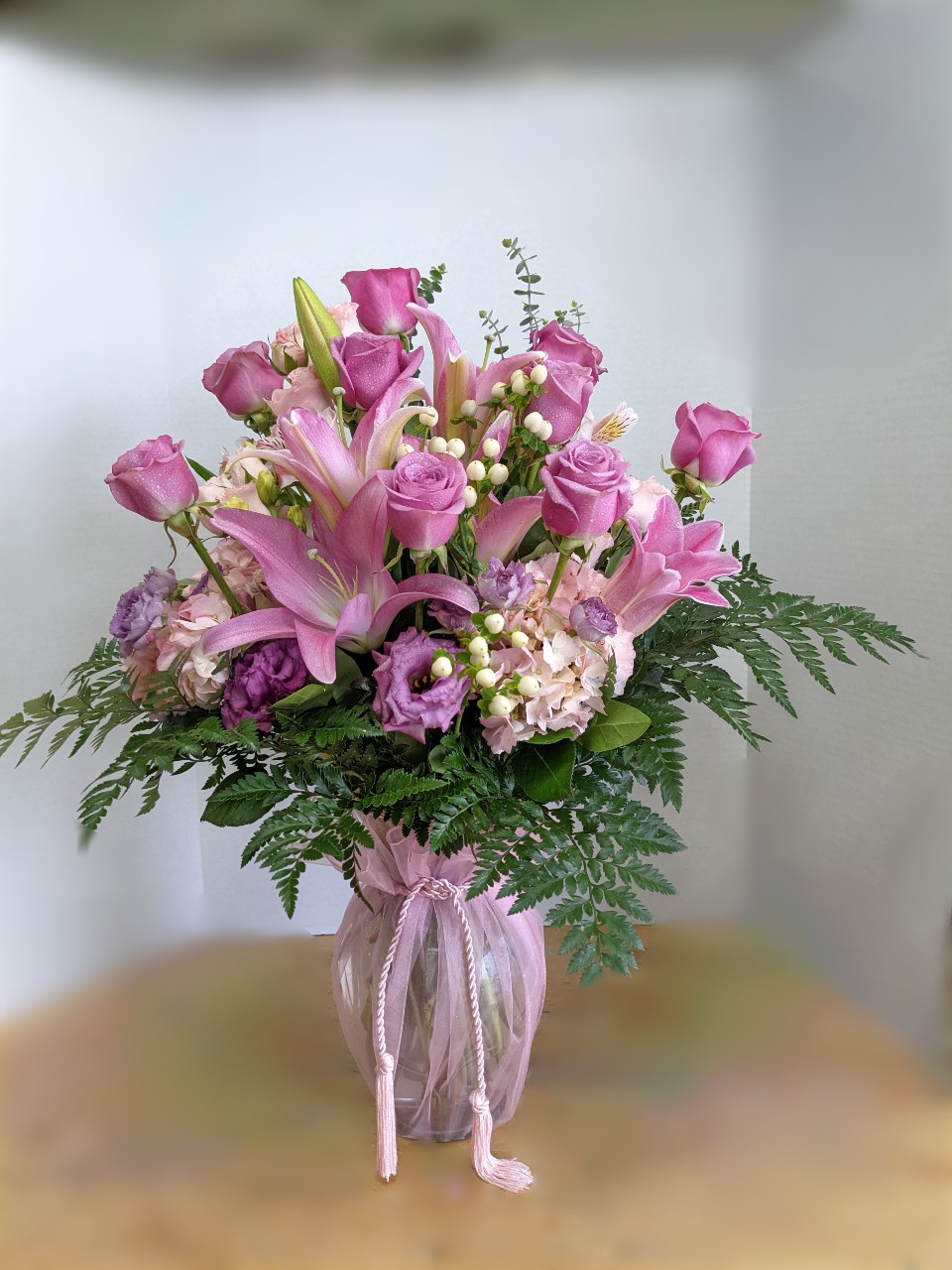 A dozen roses and hydrangeas and lilies in a large vase.
